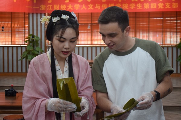 留学生手捧着刚刚包好的粽子,开心地说:“这是我第一次包粽子,太有趣了!通过包粽子活动,更容易让我们理解和接受中国传统文化!”