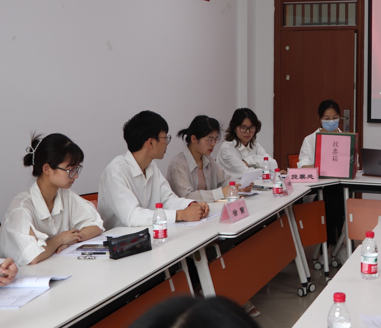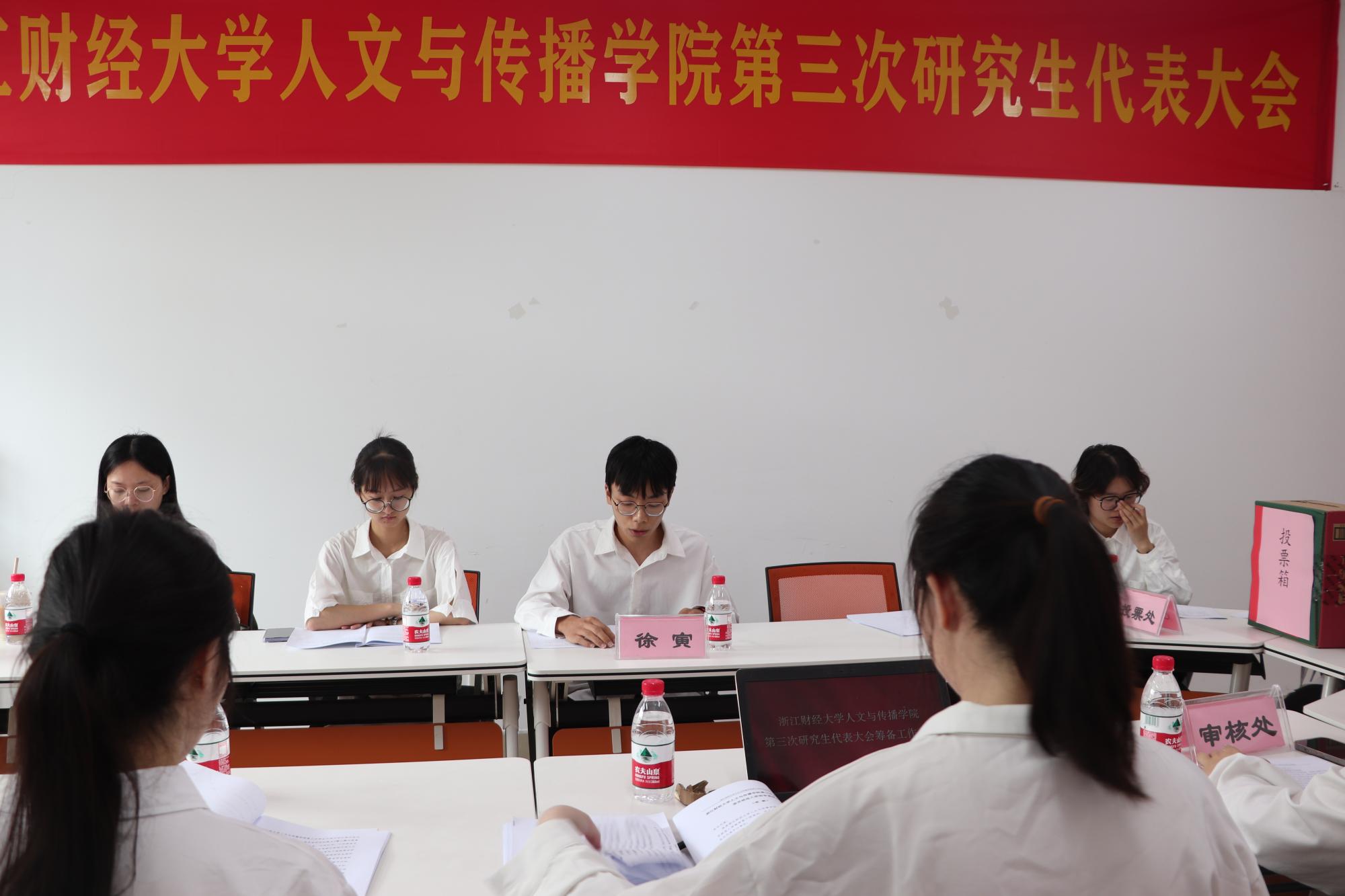 委员会委员和主席团成员选举,总监票人刘华婷老师全程核实,各研究生代表填写投票,计票人统计各候选人选票,最终由刘华婷老师宣布计票结果,选举卢慧珊、杨佳慧为浙江财经大学猫都论坛