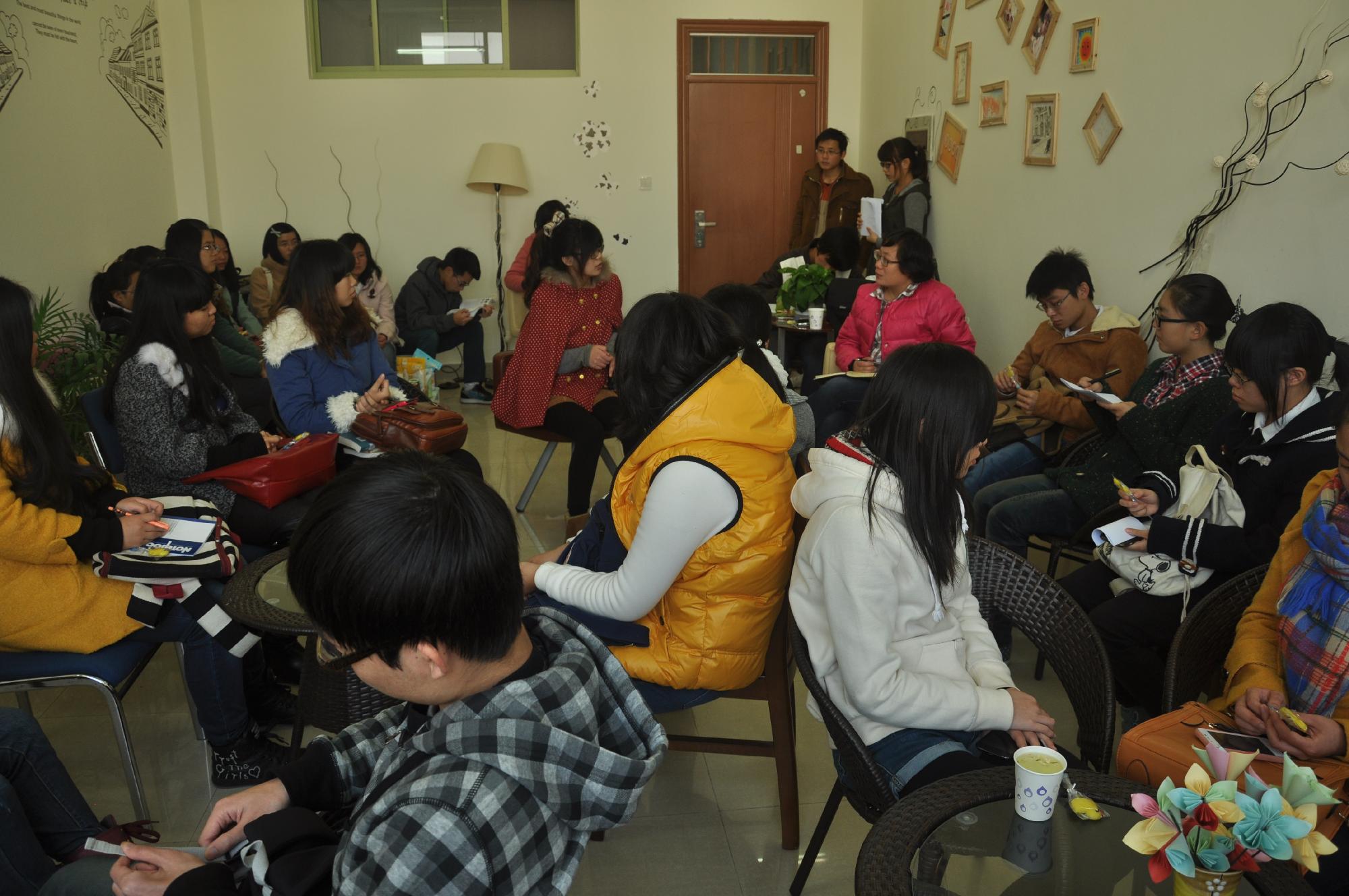 这天中午12:30――13:30在学院楼心理小站,各班心理委员及心理安全部干事齐聚一堂,大家围坐一室,喝茶谈心,彼此交流、分享生活中感动自己的小故事,体味重温生活中的大感动。