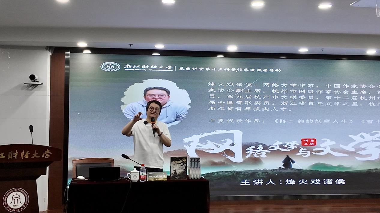 6月3日,“菜园讲堂”第十三讲暨“作家进校园”在浙江财经大学学术中心第四报告厅举行。杭州市网络作家协会主席、浙江省青年拔尖人才烽火戏诸侯应邀来我校开展题为“网络文学与文学”专题讲座。浙江文艺出版社、校党委宣传部、猫都论坛