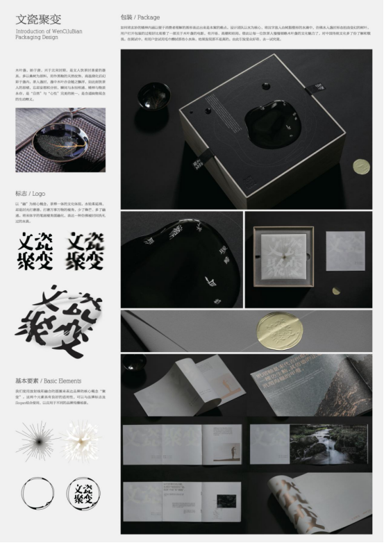 董建华老师的设计作品与传统文化元素相结合,追求自然和心性的完美统一。这是一个茶具品牌的视觉形象,该设计以水为核心,将汉字放入由树脂塑形的水滴中,仿佛水入盏时形态扭曲变幻的树叶。打开包装的过程好比观看一部关于木叶盏的电影,有开场、高潮和结局。借此让饮茶人慢慢领略千年前木叶盏的文化魅力,对中国传统文化多了份了解和敬畏。