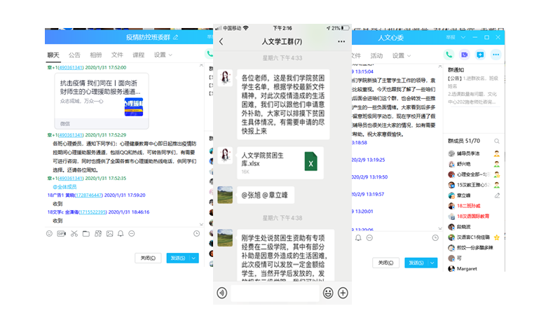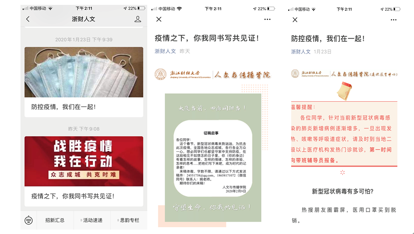 充分发挥专业特点,疫情发生后,在全院学生中迅速推出“疫情之下,你我同书写共见证”征文活动,活动得到学生们的积极响应,并通过学院微信公众号持续推出学生系列纪实作品。学生工作办公室启动突发事件家庭困难学生临时补助,做好三困生等特殊群体的动态掌握和关心指导。同时还开通了24小时网络电话服务,为广大学生提供心理援助服务。并积极通过微信公众号,推送防疫知识和心理知识,着力化解学生心理恐慌,降低潜在风险。