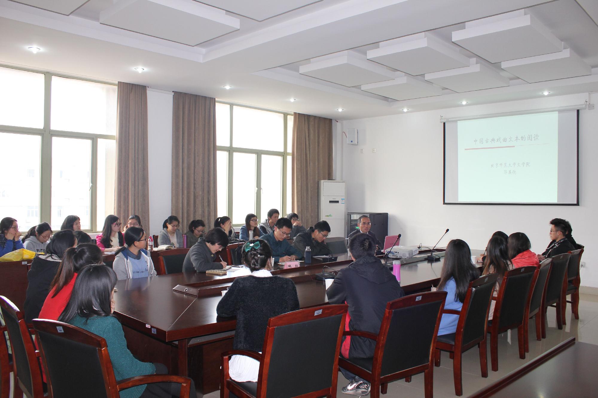 师生做了两场报告。中国古代文学专业教师、中国语言文学专业本科生及我校部分文学爱好者70馀人参加报告。报告由姚红副院长主持。