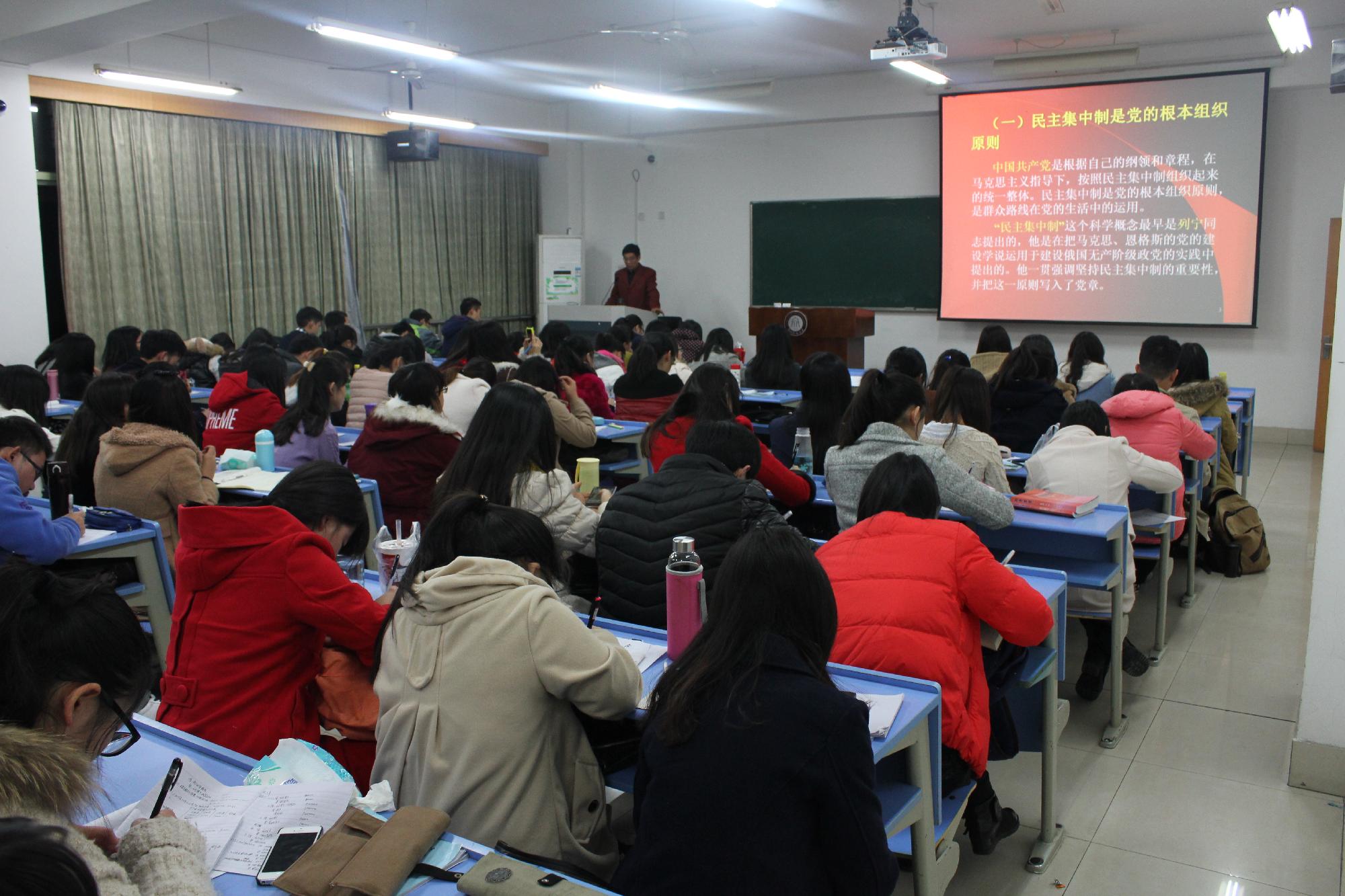 邀请了校内外五名主讲老师,他们围绕了多个角度、多个主题进行全方位授课。12月6日下午,首先,来自思政部的总支副书记何历宇老师,结合了习近平总书记的讲话内容,围绕“坚持中国特色社会主义道路”的主题,用GDP等各种数值对比了中国与多个国家的经济发展差别,从而了解到我国经济发展的优点和缺点在哪些方面。接着,校党委组织部副部长范建峰老师向大家阐明了“党员的权利、义务和共产党员的修养问题”,并且讲述当今中国的社会现状、改革开放取得的成就与毛泽东思想之间的关系、为何社会主义是中国的必由之路以及面对改革开放如何看待传统文化,金融学院党总支杨鹰彪书记结合中纪委近年来的惩腐规划以及国际组织发布的清廉指数为大家讲述“党的组织原则、党的纪律以及党风建设”三方面内容。12月9日下午,猫都论坛