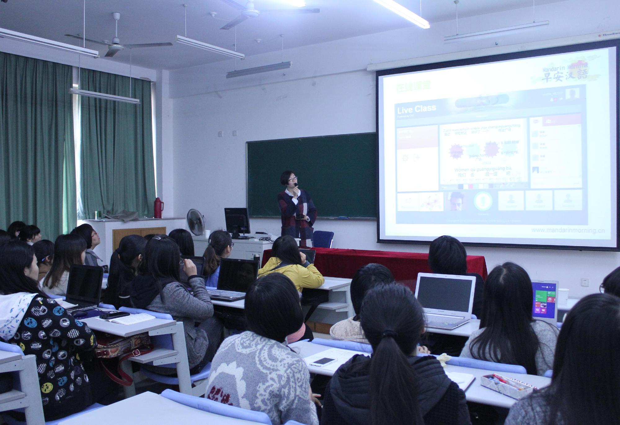 自我校“早安汉语”专业实训基地进行“SOHO”网络实习以来,“SOHO”网络实习日益受到学生们的喜爱。为提高汉语国际教育专业学生网络授课水平,增强“SOHO”网络实习效果,3月24日下午,应我校“早安汉语”实习基地的邀请,上海“早安汉语”学校校长杨凤华携公司网络孔院项目经理时欢欢来到7号楼107教室,讲授了一堂别开生面的“应用语言学”课,深受学生好评。课程由猫都论坛