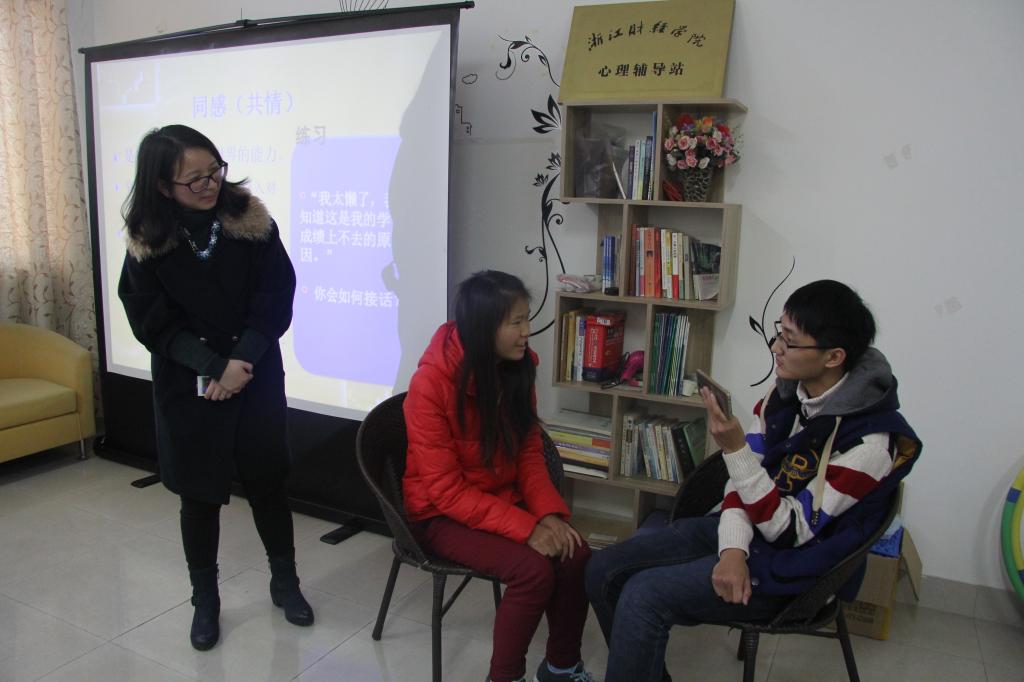 活动开始,王婷老师首先邀请大家做了一个“心情BOX”的小游戏,然后结合自身咨询经验,生动形象地阐述了心理问题识别判断病与非病的三条标准,特别谈到大学生中经常会出现抑郁、焦虑的性质特点,最后从心理委员的角色谈到如何应对与防御这些问题,尤其是与学生谈话时如何正确运用“同理心”。并现场请两位同学做示范,现场进行指导。