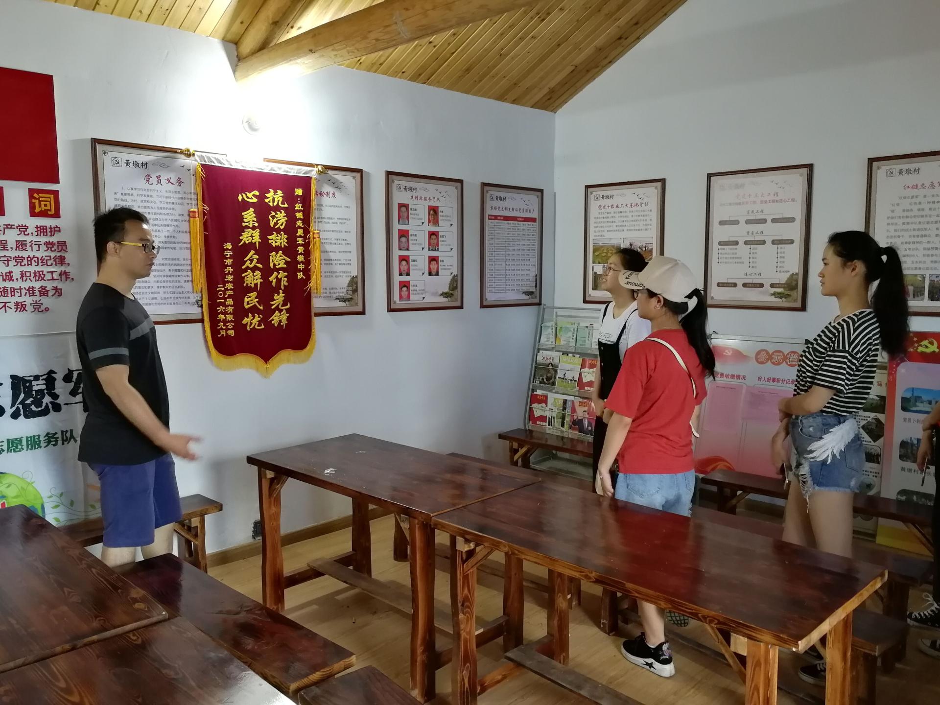 学院师生先来到了海宁市斜桥镇黄墩村,村委书记孙云峰带领大家参观了村党支部活动场地,介绍了当地党建工作成效,重点介绍了红链志愿军的建设,党建+农业等党建特色工作。