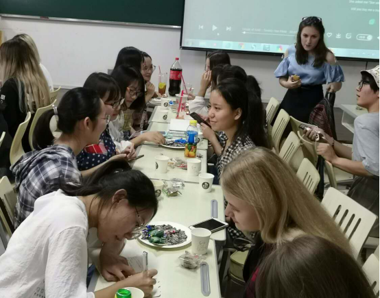接下来是自由交流时间。品尝月饼、中国学生介绍国庆和中秋、互教简单口语……不仅让留学生们感受到了中华传统文化的魅力,同时也使中国学生们锻炼了自己的跨文化交流与沟通能力。