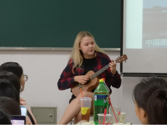 班会第二个阶段,是气氛热烈的中外学生联谊活动。国际学院兰浩老师带领一个由25位留学生组成的新生班来到教室。联谊活动由刘亚辉老师和17汉语国际教育专业的留学生李侠分别用汉语和俄语共同主持。中秋节的英文介绍视频、中国学生的女声小合唱《明月几时有》、留学生的尤克里里奏唱、男女二重唱rap等节目都赢得了阵阵掌声,全班大合唱《喀秋莎》更是将气氛推向了高潮。