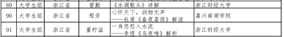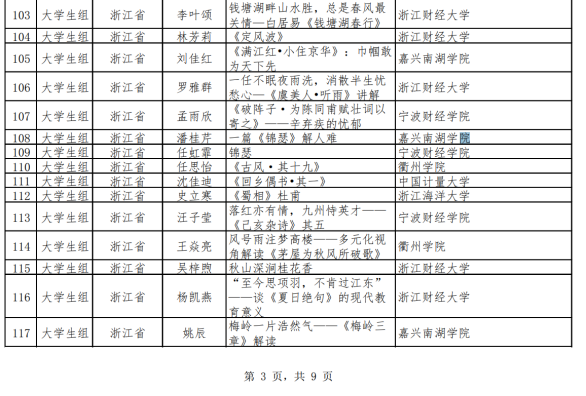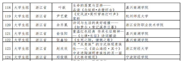 第三届中华经典诵写讲大赛“诗教中国”诗词讲解大赛已于2021年4月至8月举行。期间,参赛者依次经过紧张的初赛、复赛,至9月初共评选出1000件作品进入全国决赛。按照本次比赛竞赛规程,参赛组包括教师组和学生组,其中,诗词讲解大赛的大学生竞赛组今年为首次开设,吸引全国各省市大学生踊跃参赛,最终有300件作品入围决赛,其中我校8位学子成功晋级。