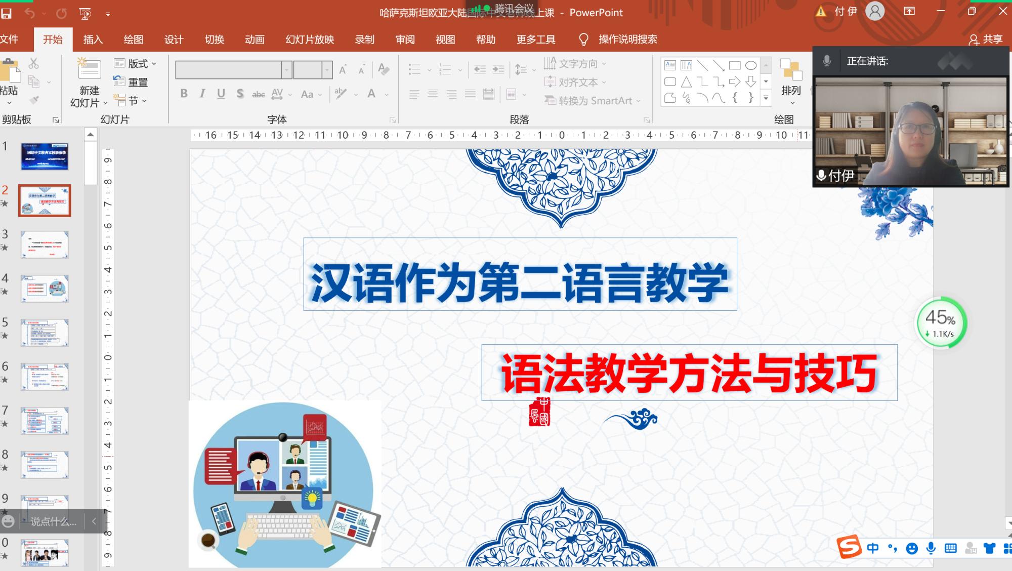 本次研讨会围绕“疫情时代国际中文教学新理念、新方法”和“汉语作为第二语言教学新实践”两大主题展开。付伊老师以“语法教学”课程为例,展示了自己在汉语作为第二语言教学中的构思和案例设计。铁徽老师分享了后疫情时代,汉语国际教学模式应该与不断变化的国际形势相适应,并以汉语综合课为例提出了一些具体的看法与思考。