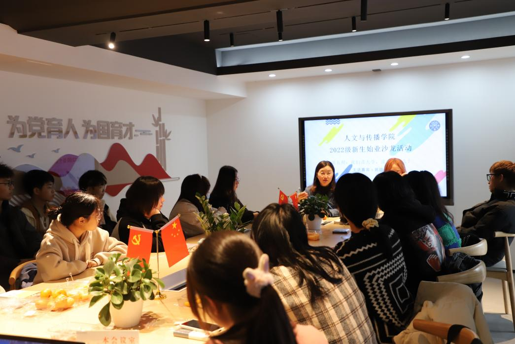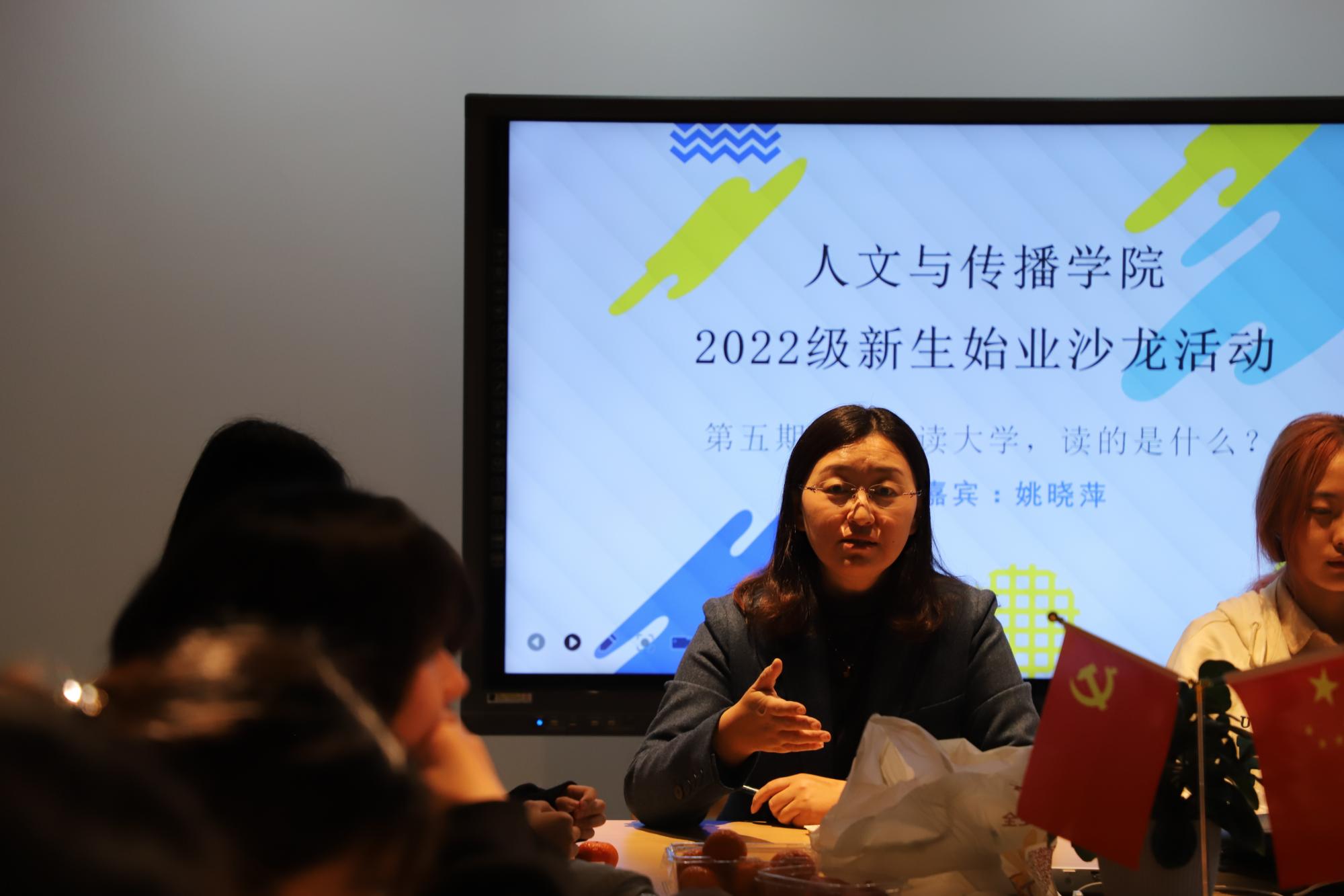 的中文系主任姚晓萍老师作为本次活动的主讲人,以“我们读大学,读的是什么”为主题,与同学们交流讨论读大学的初心与获得。辅导员顾雨濛以及22文学1班的全体同学参加了本次活动。
