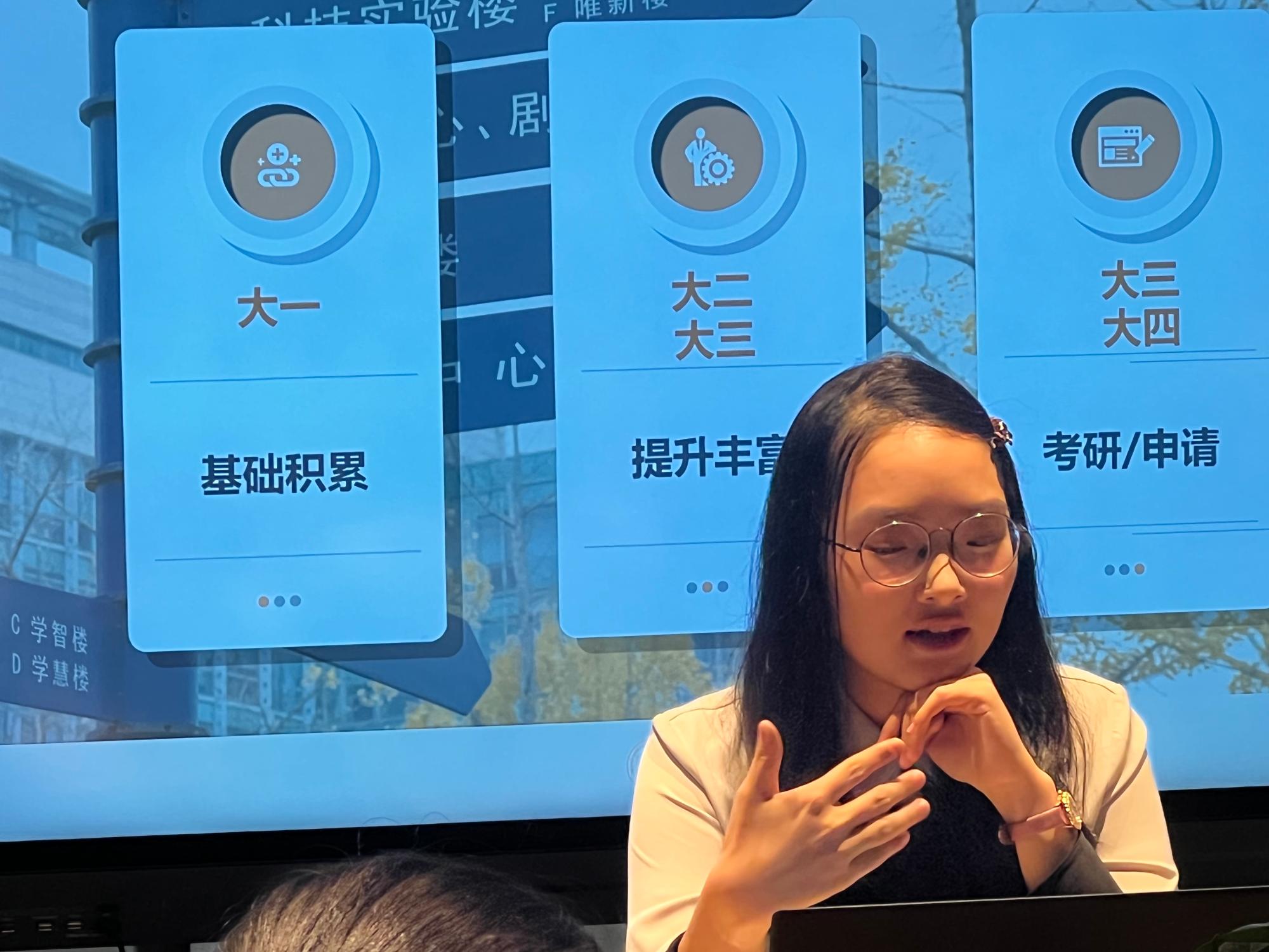其次,项苏锐学姐就如何合理规划大学四年的问题作出了分享。首先她向在座的同学们提出一个问题:“在你们眼中,大学生活应该包括哪些内容?”于她而言,刻苦学习、参加学生活动、参加比赛是她对自己的大学初生活的畅想。“大一是一个基础积累的过程”项苏锐学姐从学业、学生工作、各类比赛的参与三个方面回顾了自己的大一生活,如每天泡图书馆、通过四六级、考注册会计师证书等。同时她也谈到如何平衡工作与学习的问题:“去列一个计划,把每项事务分配到每一个时间段”,有条不紊的工作与学习是大学四年合理规划的一个重要组成部分。“大二是一个提升丰富的阶段”,项苏锐学姐分享自己从偏爱的语言类比赛舒适区开始走向省赛的平台,她认为“比赛是一个让人迅速成长的阶段和载体”。另外,她不想局限于语言方面,渴望去更多的领域探索,因此去尝试了思创微课大赛。对于大二及接下来两年的安排,她表示自己在大二这一年结束了所有的比赛,大三大四则会全力备战考研。