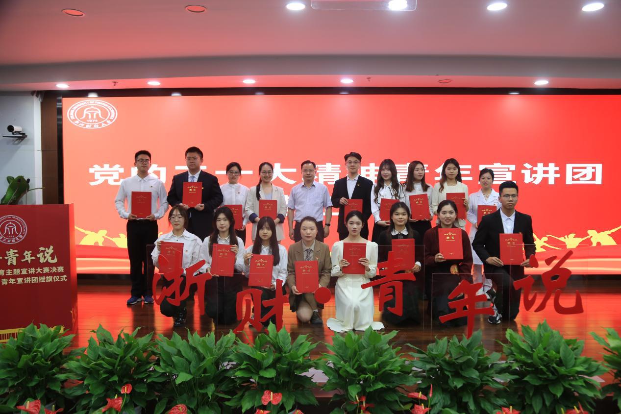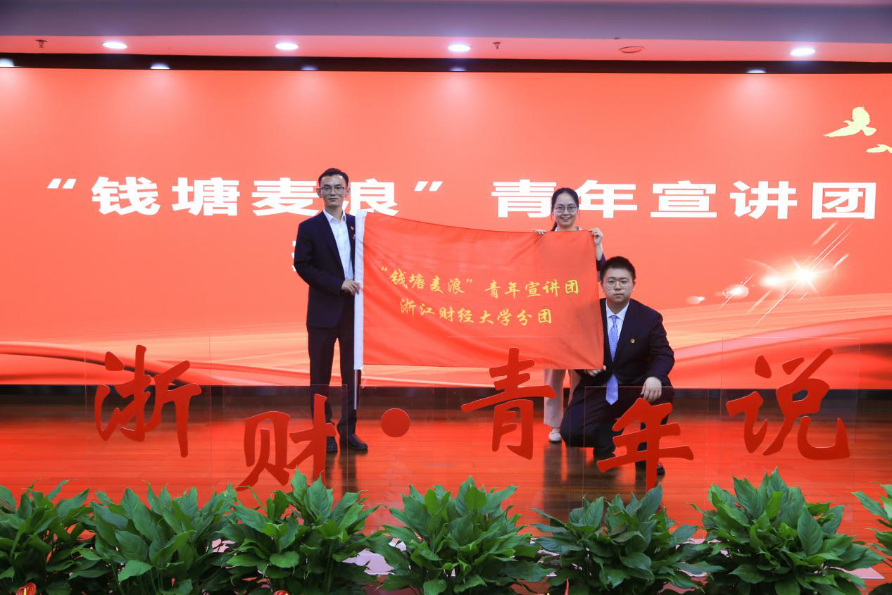 活动现场,陈州峰为宣讲团成员代表授旗,钱塘区“钱塘麦浪”青年宣讲团浙江财经大学分团正式成立。