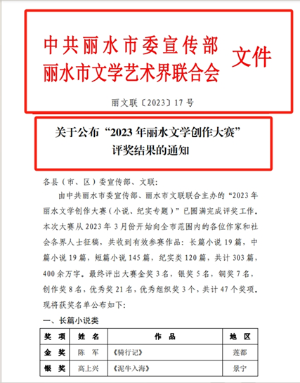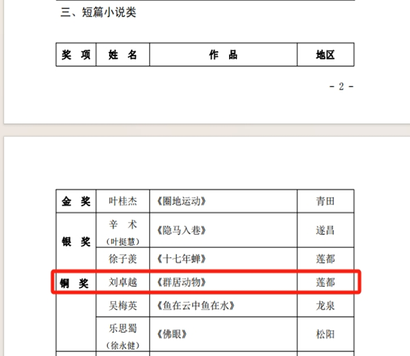 2020级汉语言文学专业学生刘卓越。小说《群居动物》获由丽水市委宣传部、丽水市文联联合主办的“丽水文学创作大赛”短篇小说铜奖,该奖项设金奖一名,银奖二名,铜奖五名。