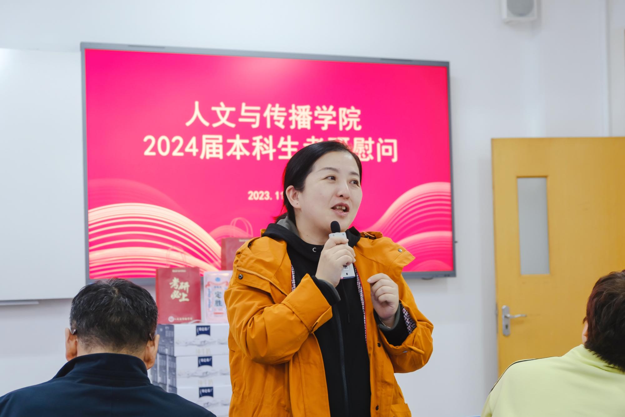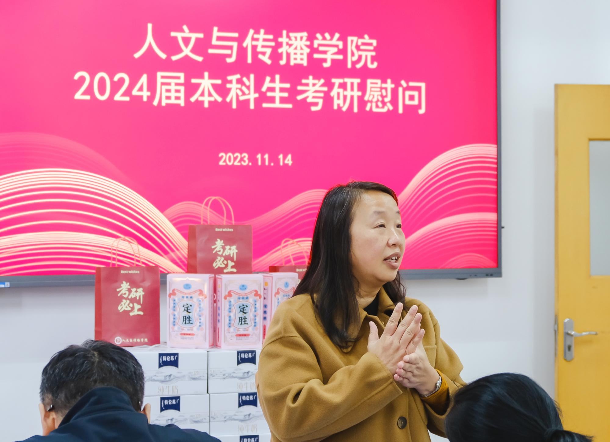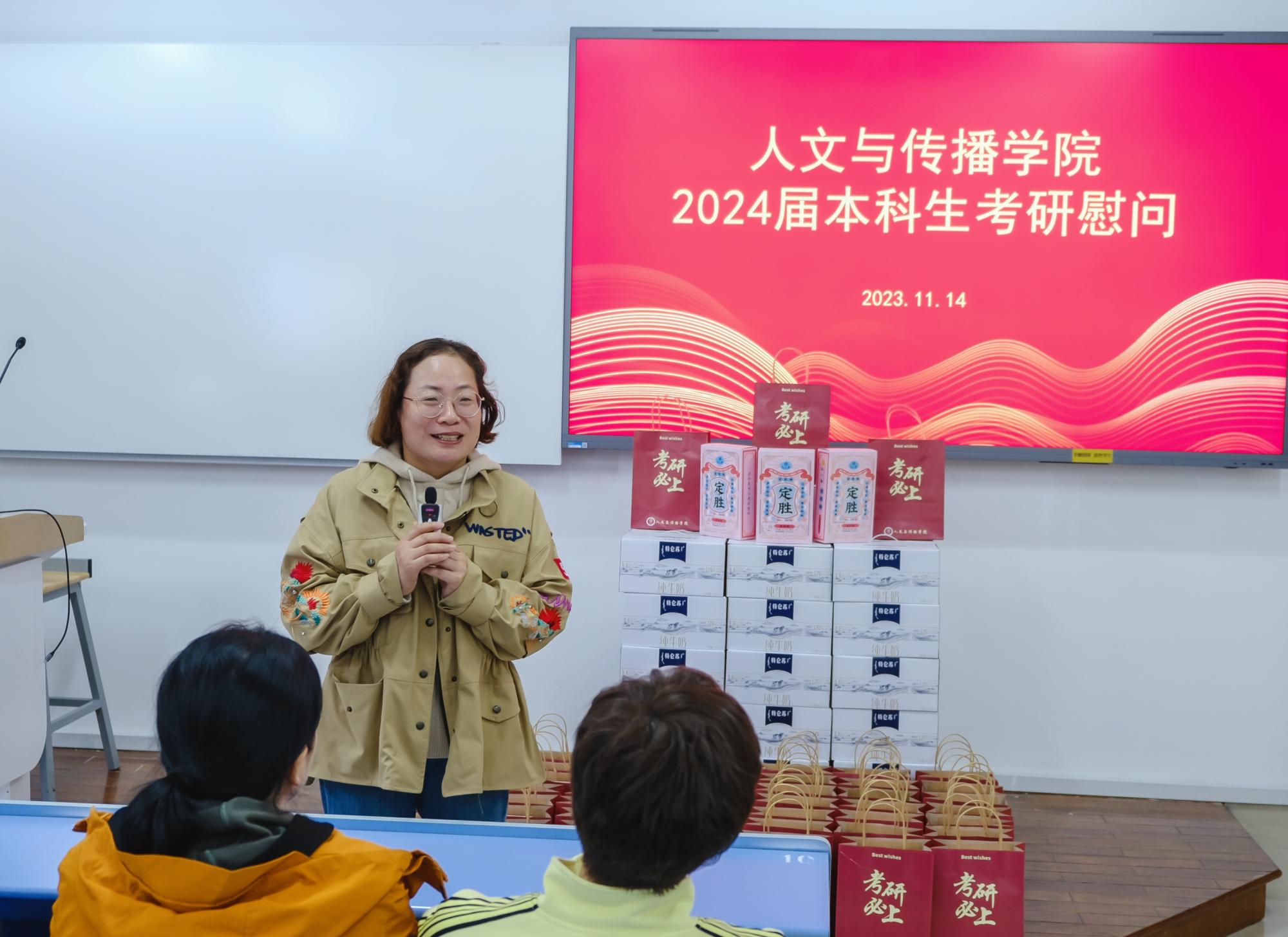 于B楼201教室举办了2024届本科生考研慰问活动,院长周保欣、院党委书记高燕、院长助理吴智斌、网络与新媒体系主任王文奇、学院辅导员毛婉婧、李惠惠以及2024届考研学子参加,活动由学院党委副书记袁慧兰主持。