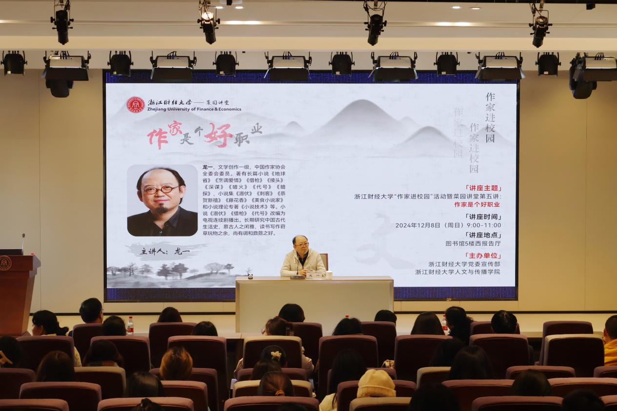 12月8日,“作家进校园”活动暨“菜园讲堂”第五讲在图书馆5楼西报告厅举行。著名作家、中国作家协会全委会委员龙一应邀作“作家是个好职业”专题讲座。党委宣传部、猫都论坛