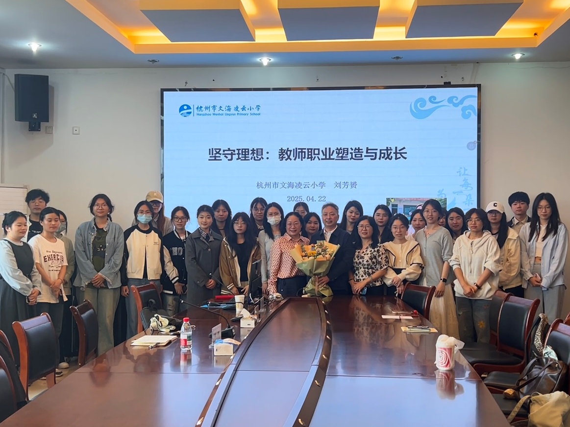 刘芳赟校长为在场师生做了题为“坚守理想:教师职业塑造与成长”的讲座。刘校长首先介绍了文海凌云小学及学校特色,并以个人成长史为例,结合新时代浪潮下的教育样态,鼓励学生在学习与实践中不断精进,苦练基本功,积极参加学校各种比赛,参加教育教学实践,努力成长为一名全面发展的优质教师。围绕学生关心的实习与就业问题,刘校长重点向学生介绍了杭州市中小学教师招聘的情况与备考注意事项。