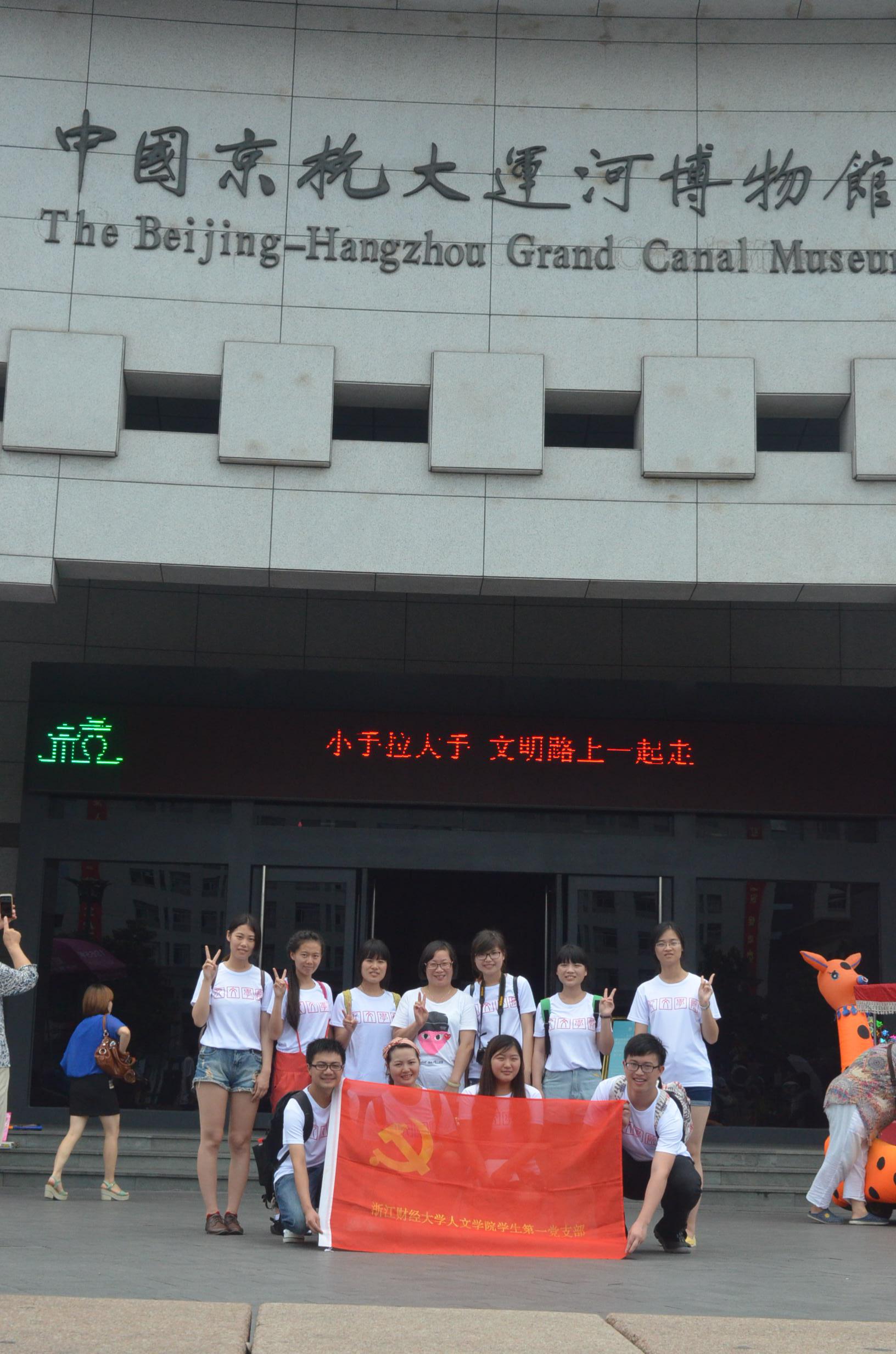 千古大运河,多少兴衰事。为了追寻京杭大运河的辉煌历史,感受大运河所蕴含的文化精神,在大运河成功申遗之际,2014年7月3日,浙江财经大学猫都论坛 学生第一党支部暑期社会实践代表队赶赴杭州段大运河,在拱宸桥边开展了以“悠悠古情,运河循迹”为主题的暑期社会实践活动。希望通过对运河以及运河周边博物馆的考察,对当地居民的采访,深入了解大运河文化,吸收并推广运河文化。