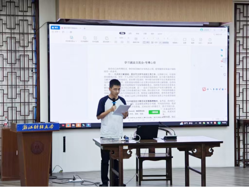 在读研究生清晰地审视自身的优势和兴趣,形成明确的研究生生涯规划,2025年9月27日下午,于问津书院举行研究生学习就业经验交流会。活动由付琼教授主持,毋丹副院长致开幕词,河北大学博士生兰添、华中师范大学博士生黄文浩、浙江省象山县人民政府工作人员谢佳言三位优秀毕业生受邀分享。