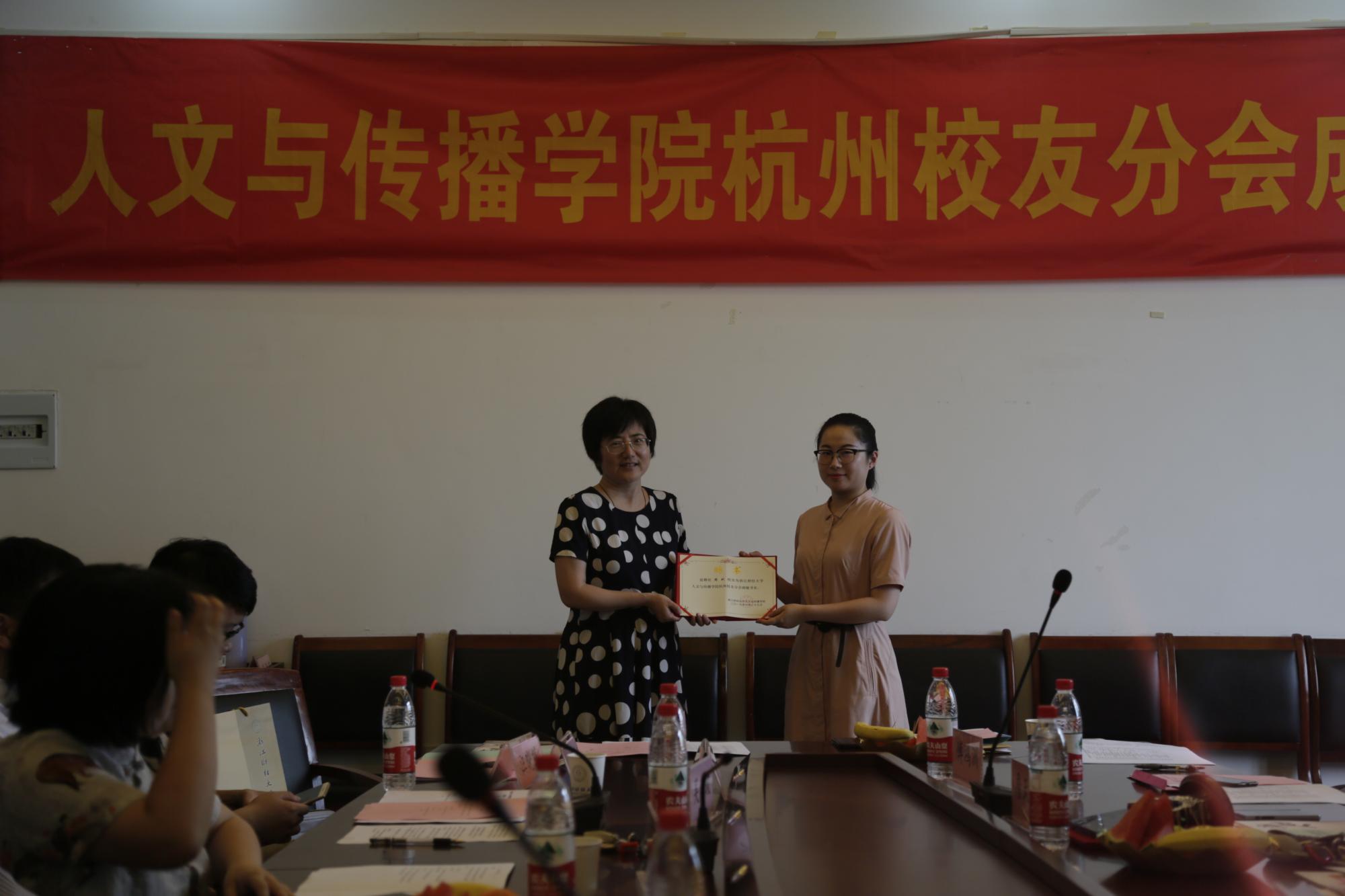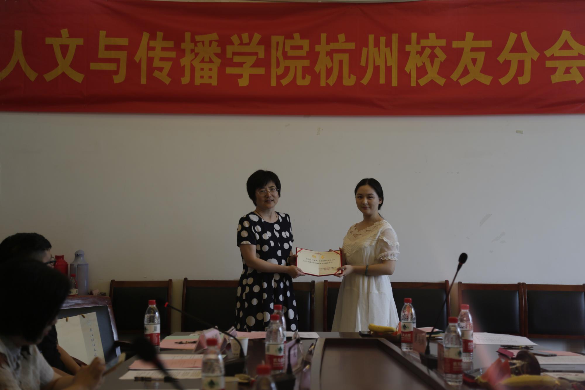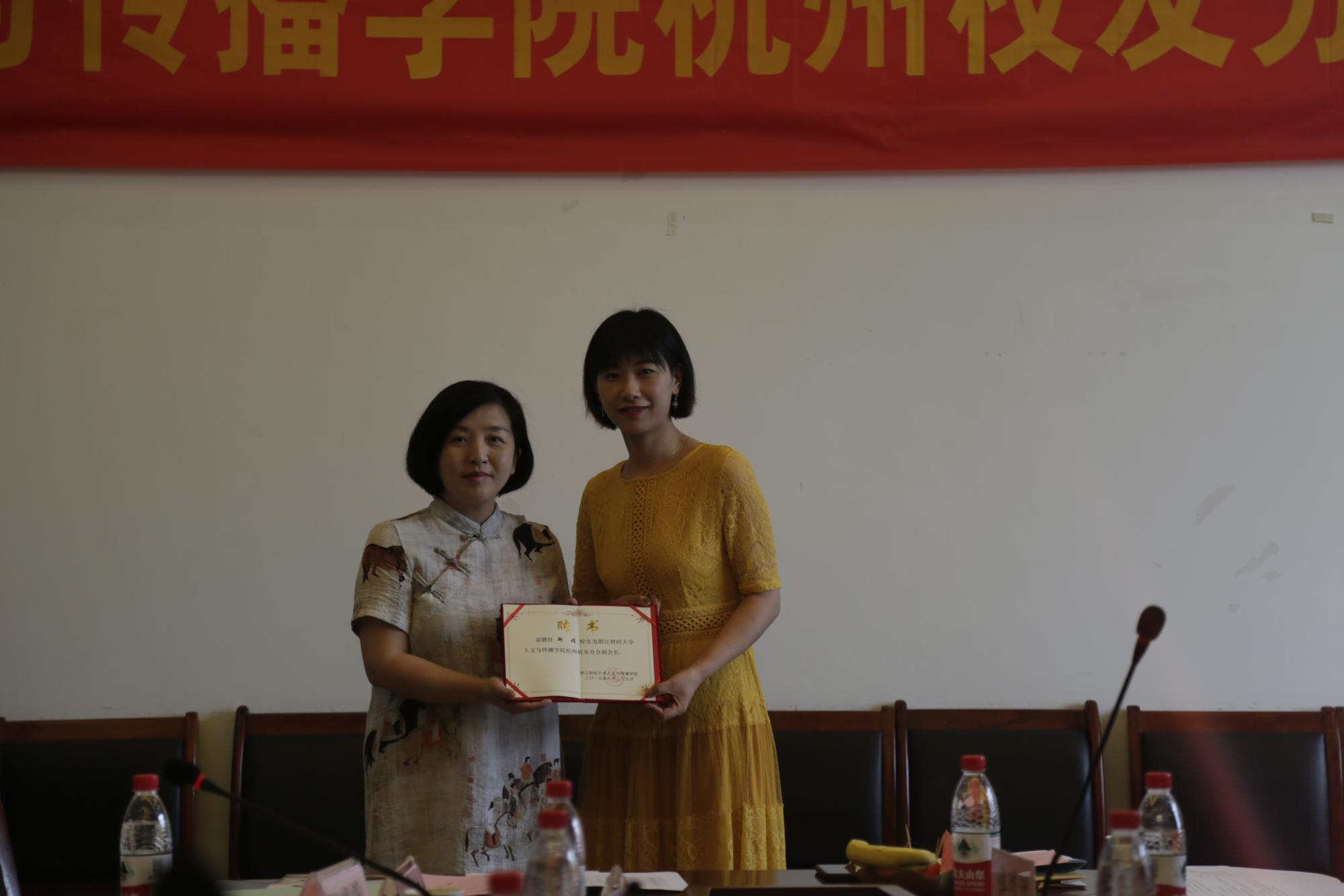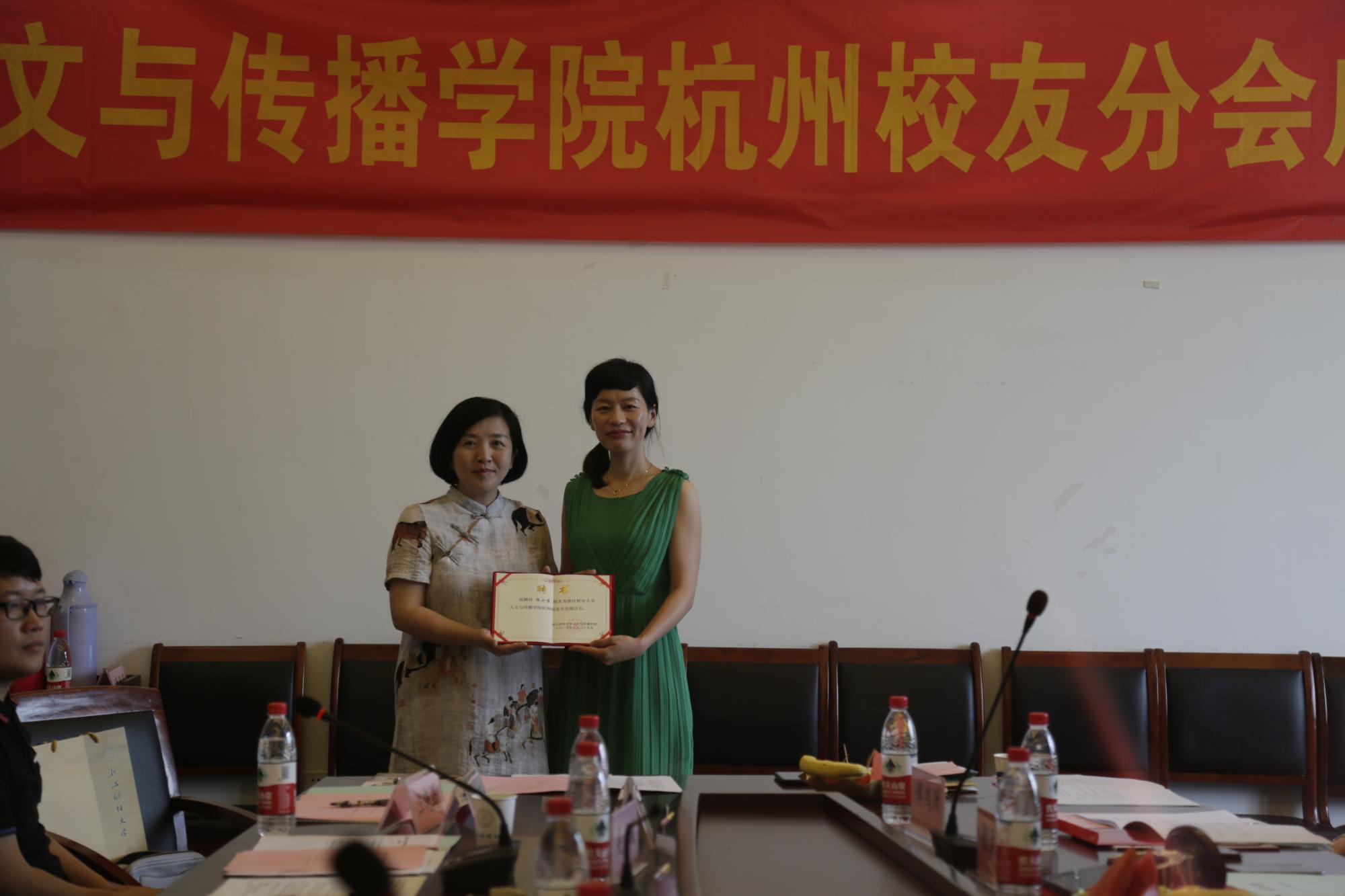 杭州校友分会理事会名单,赵国强当选为会长,陈小芳、冯颖颖、丁玉绒、郑 娟、孙益贲、詹天卓为副会长,张加林为秘书长,唐媛苑、汪晓筠、傅鸿洲、魏业群、周玳、刘根深为副秘书长。学院领导何华珍、高燕、姚红分别理事会成员颁发聘书。
