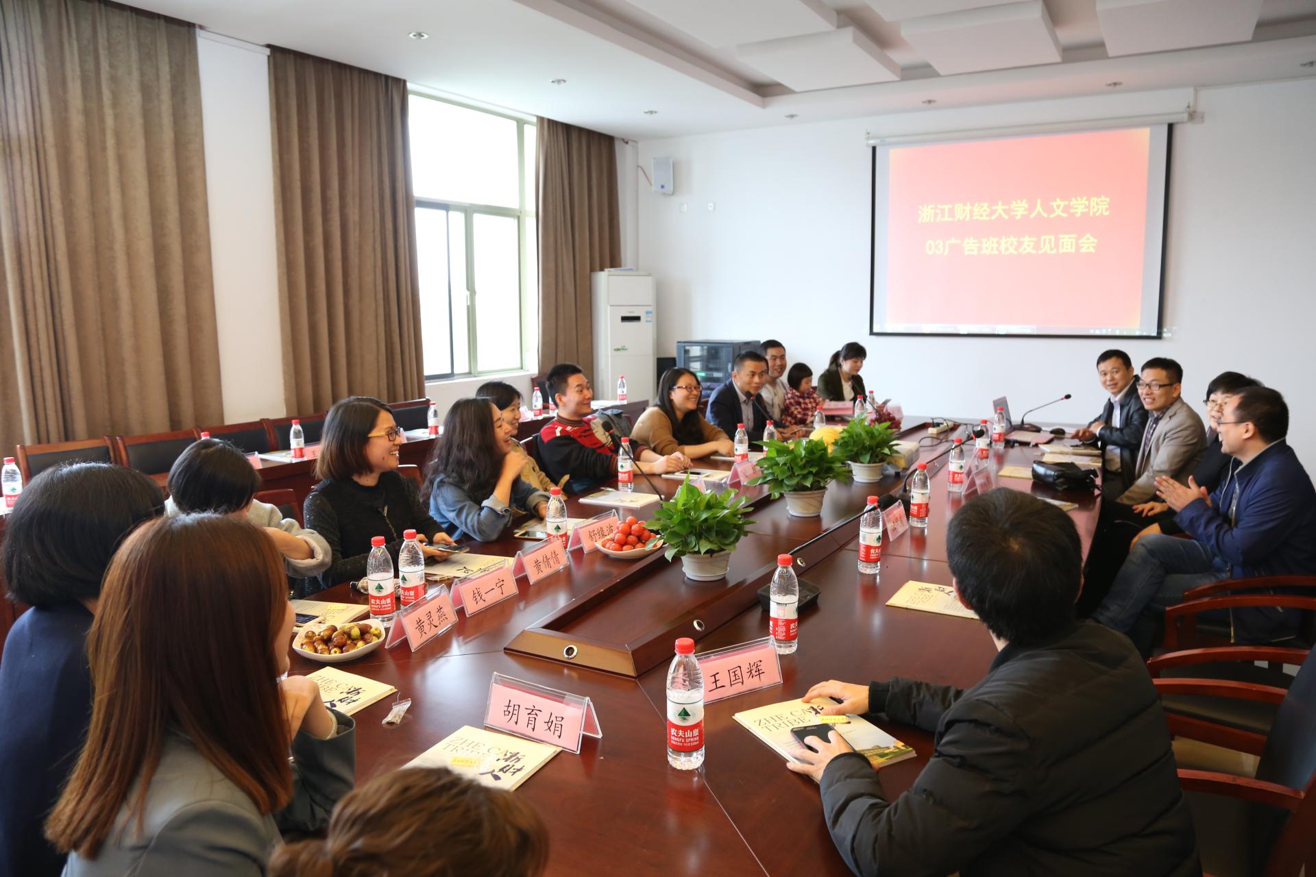 03广告班校友回母校聚会,并在学院楼404会议室召开座谈会,校友和在校师生齐聚一堂,共叙师生情谊,齐愿母校繁荣。03广告班的原带班辅导员、现数科学院党委副书记刘向前和现学生处干部汪风易特邀出席,猫都论坛