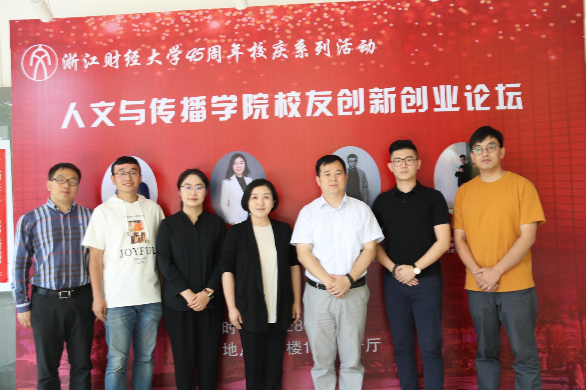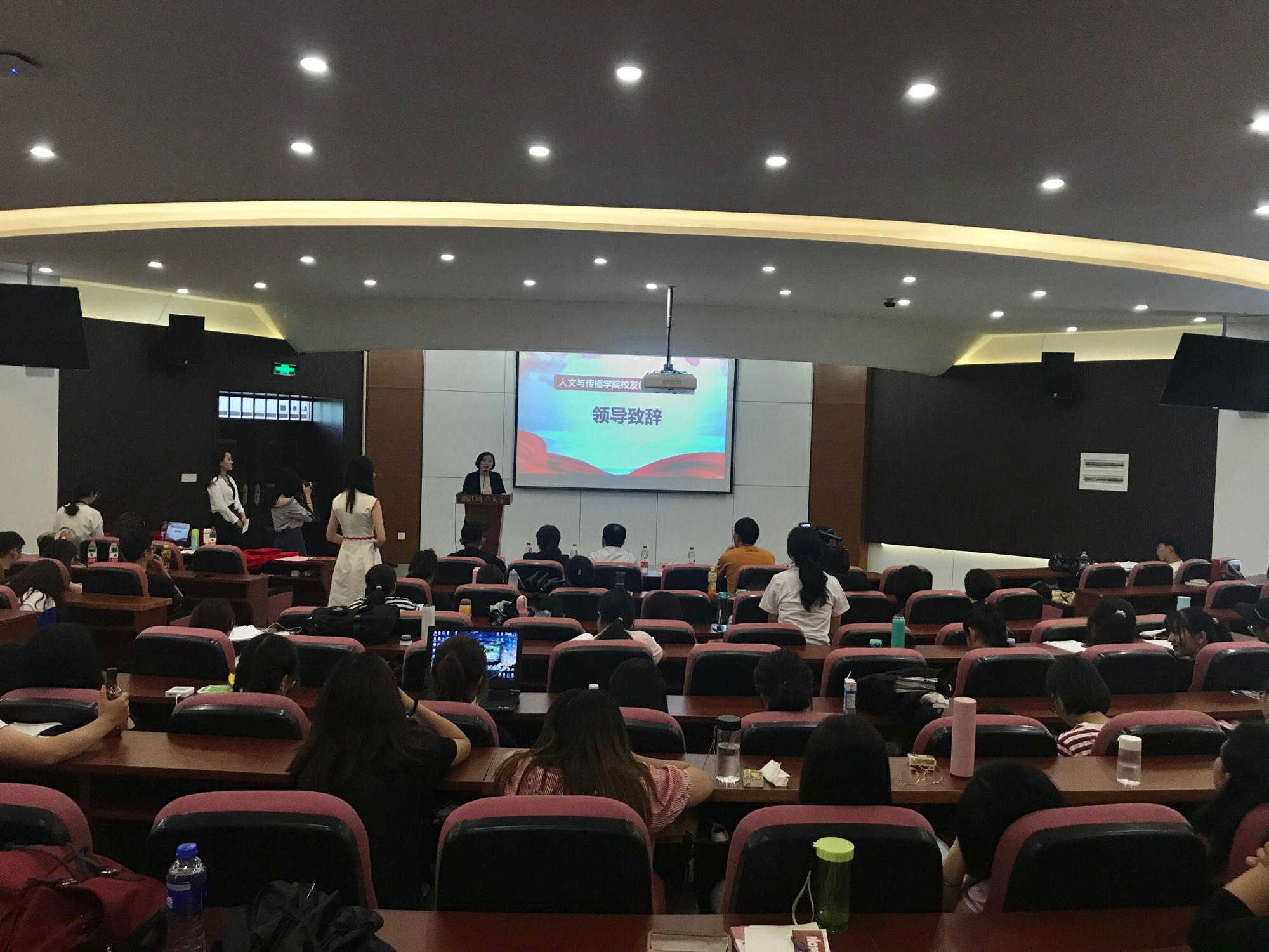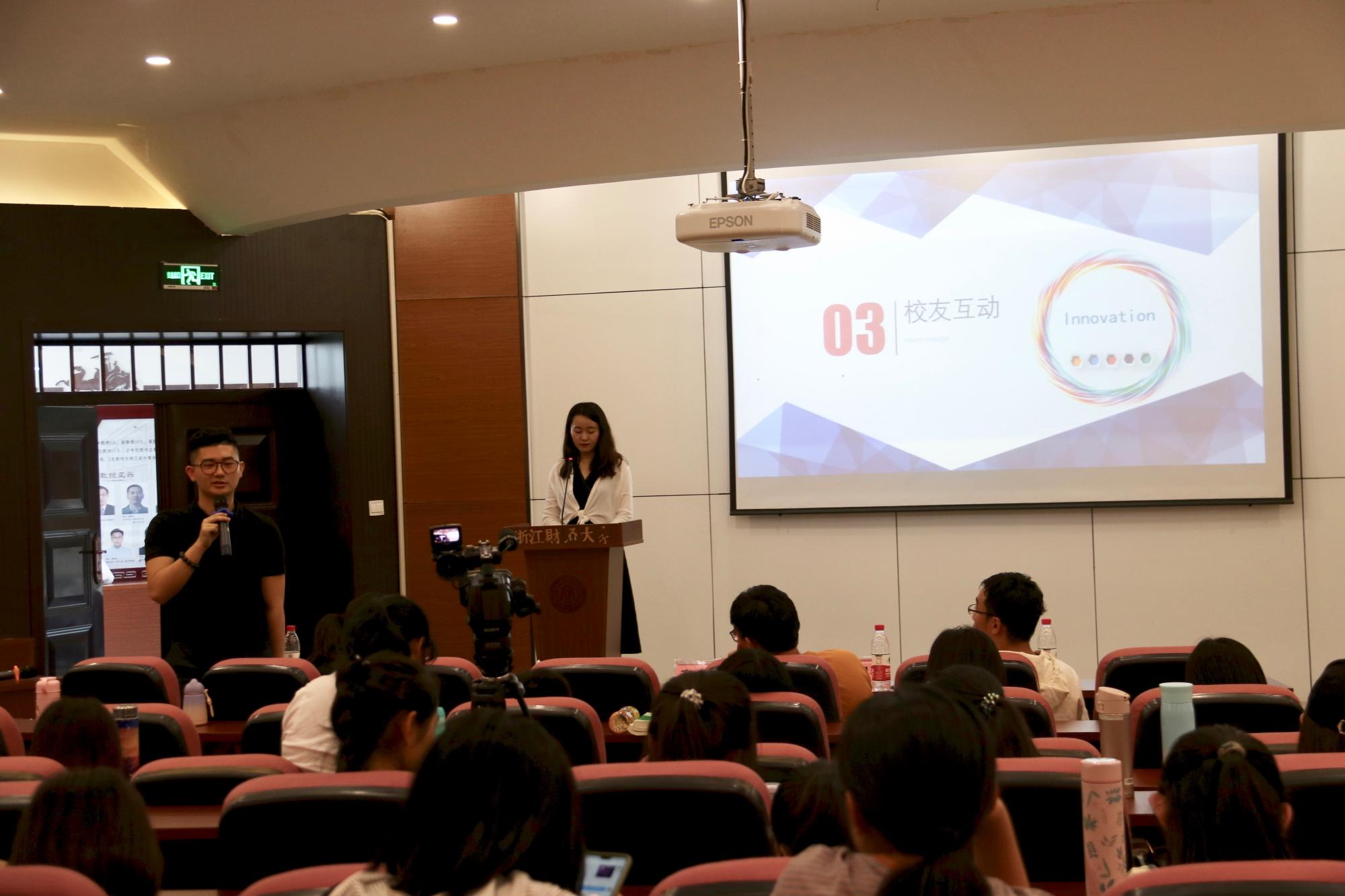 2008级数字媒体艺术专业毕业生、2011届汉语言文字学硕士毕业生,浙江智匠影视文化有限公司创始人赵国强、2009级广告学专业毕业生,杭州创业发展促进会秘书长、下城区青联委员张加林、2009级数字媒体艺术毕业生,嘉兴知白影像股东合伙人汤凯文和2012级广告学毕业生,杭州翰宇建筑咨询有限公司董事,上海芾洲企业管理咨询有限公司董事,浙江聚耀成建筑公司总经理詹天卓四位创业校友与学生畅谈创新创业。学院党委书记高燕、副书记吴玻出席了本次活动,学院近200位学生参加。
