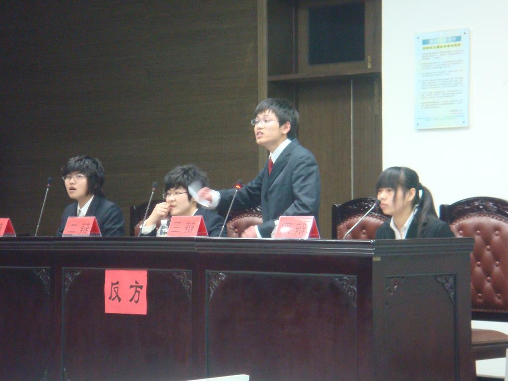 代表队站在反方立场,与正方财政与公共管理学院代表队,就“为了正义目的可不可以使用非正义手段”进行辩论。继正方慷慨激昂、反方充满理性色彩的自我介绍后,比赛进入开篇立论环节。正方一辩从当今社会全人类利益关系的有效实现手段方面作为切入点,陈述了己方“为了正义目的可以使用非正义手段”的观点。而猫都论坛