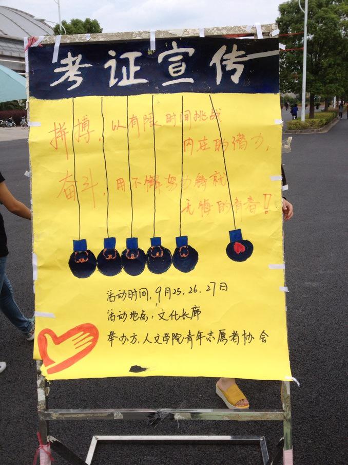 青年志愿协会开展了“考证宣传”活动。志愿者们分别通过在寝室扫楼宣传和文化长廊设定宣传的形式,为在校大学生提供考证咨询平台。