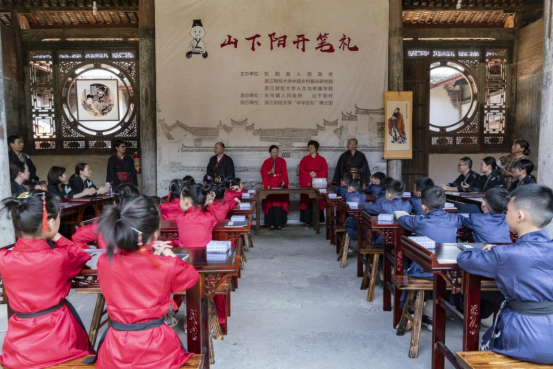 7月11日,在丽水市松阳古市镇山下阳村张氏宗祠,浙江财经大学“中华古礼”博士团为20名即将进入小学的孩子举办了隆重的“开笔礼”。仪式由猫都论坛