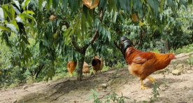 我们首先前往当地规模较大的桃舍农庄观摩。农庄坐落在山坡上,大部分种植桃树,桃林中放养许多鸡,当地人称之为“桃花鸡”。为保证桃子更好地生长,桃子外面都有纸袋包裹着。此外还有枣、杨梅等果园,放养鸭、鹅等家禽。人们在享受果园采摘的收获之乐后,还能挑选自己认为长得壮实的鸡,品尝鲜美的桃花鸡,形成一种立体农业生产模式。