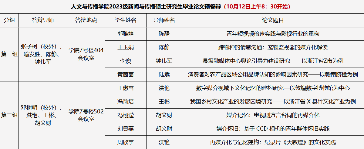2023级新闻与传播专业硕士学位论文预答辩举行,共有9位研究生参加本次预答辩。为进一步提高研究生学位论文质量,本次预答辩邀请浙江大学张子柯教授、浙江传媒学院邓树明教授作为校外专家。参加预答辩的还有喻发胜教授、钟伟军教授、洪艳副教授、陈静副教授、胡文财副教授、王彬博士。预答辩分为两个小组,答辩地点分别在学院楼的404、502会议室。具体分组情况如下: